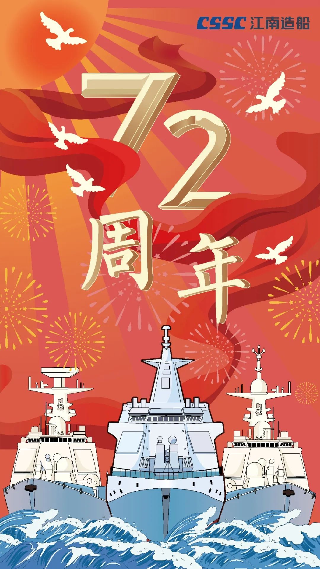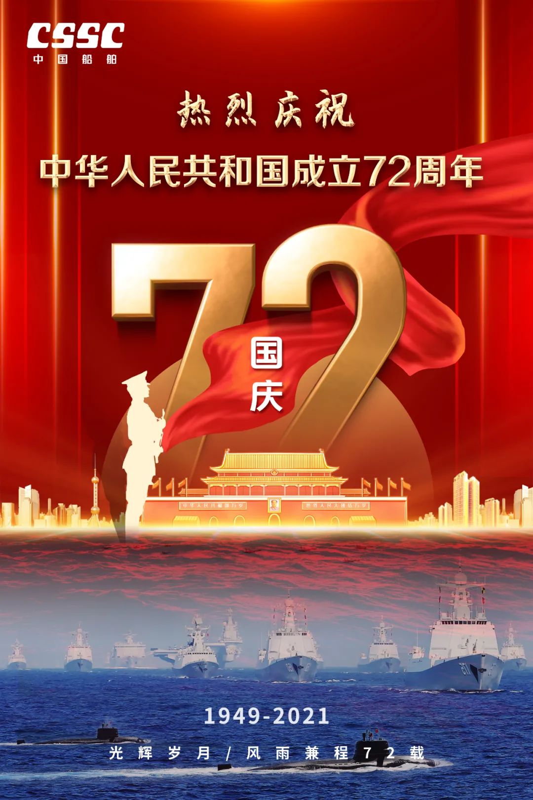 今天,我們迎來新中國72周年華誕。作為我國海軍裝備建設(shè)的主力軍,中國船舶大船集團(tuán)將不忘初心,牢記使命,堅(jiān)定貫徹海洋強(qiáng)國、制造強(qiáng)國、科技強(qiáng)國國家戰(zhàn)略,聚焦主責(zé)主業(yè)、聚力興裝強(qiáng)軍,為實(shí)現(xiàn)中華民族偉大復(fù)興的中國夢而不懈奮斗。