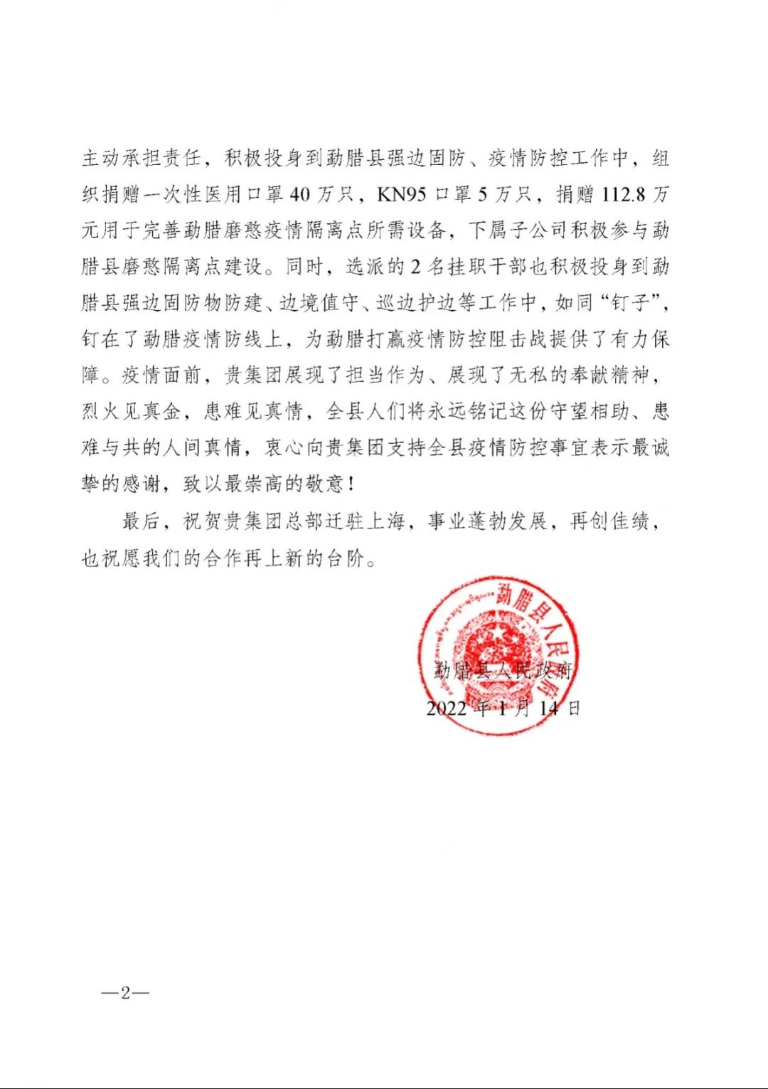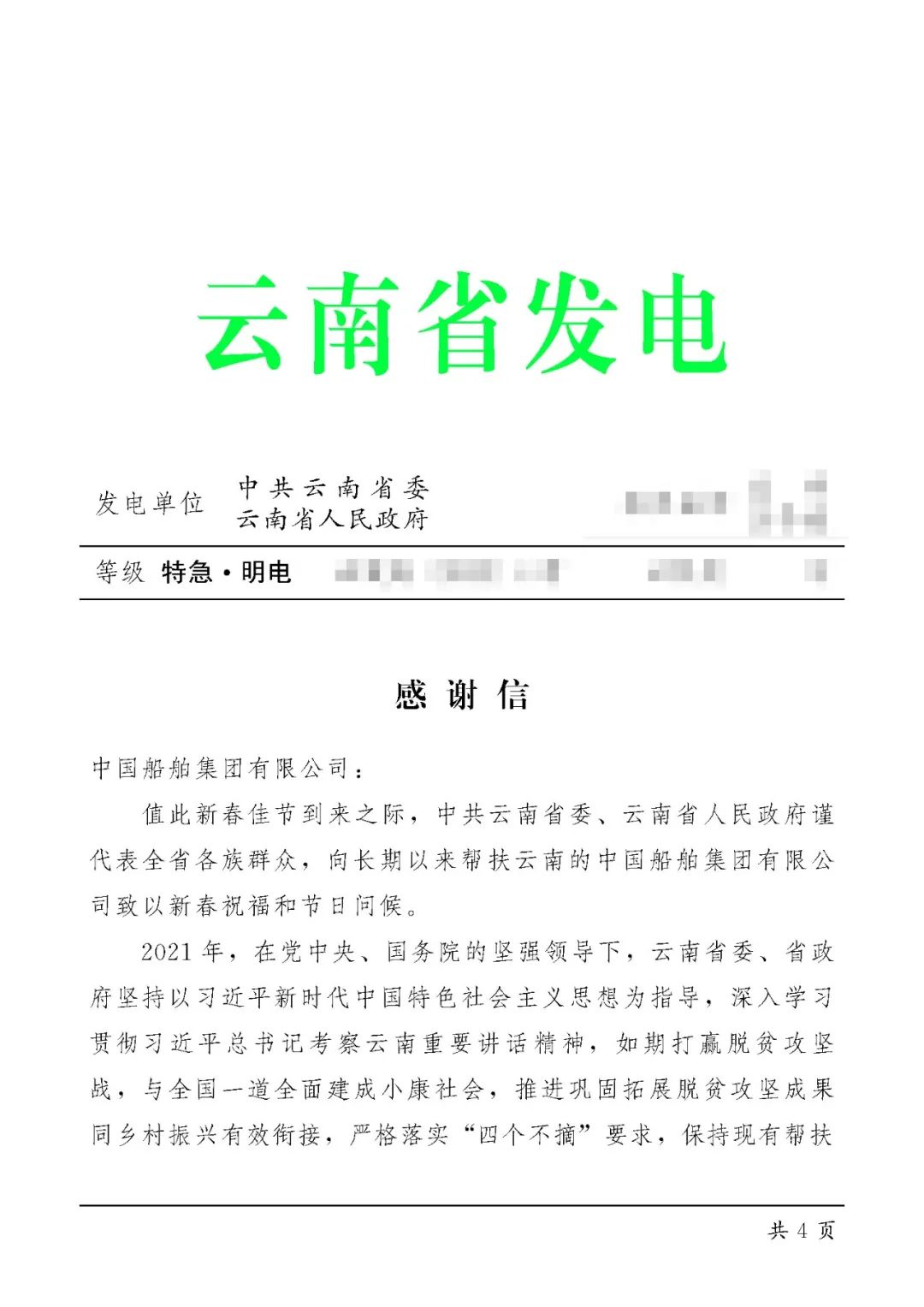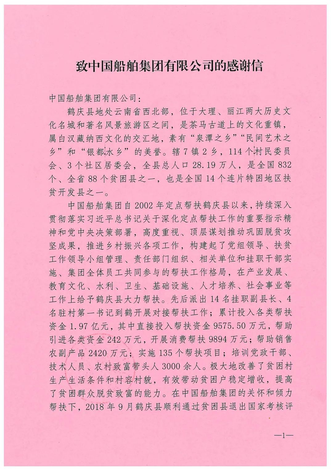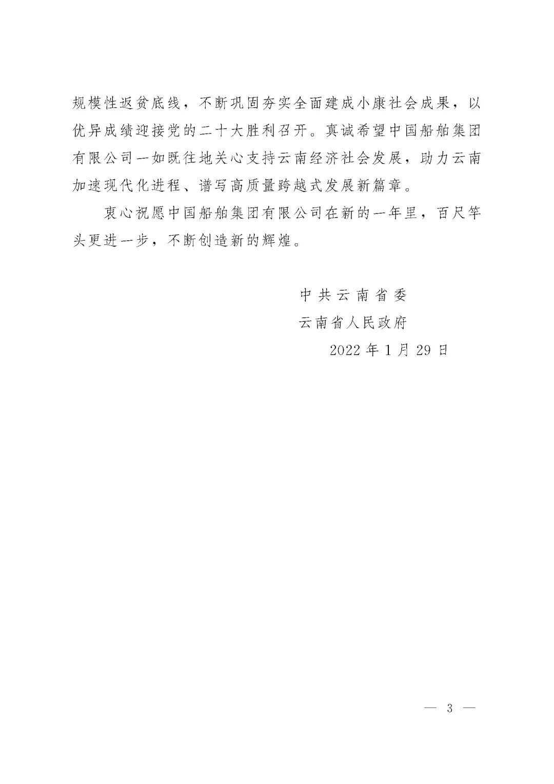 春節(jié)前夕,中國船舶集團(tuán)陸續(xù)收到云南省委省政府、文山州委州政府、鶴慶縣委縣政府、勐臘縣政府發(fā)來的感謝信,對(duì)集團(tuán)公司長(zhǎng)期以來給予鶴慶縣、勐臘縣、丘北縣的傾力幫扶表示衷心感謝和崇高敬意。