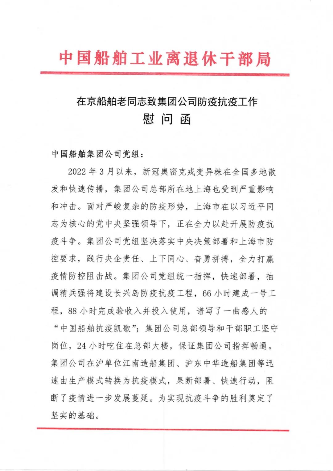 抗疫形勢嚴峻復(fù)雜,中國船舶集團離退休老領(lǐng)導(dǎo)老同志關(guān)注抗疫、心系集團,為干部職工加油鼓勁。