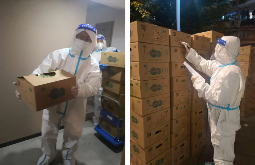 由于防護(hù)服有限,居住在黃浦區(qū)某社區(qū)的集團(tuán)職工中只有鄭珂成了志愿者,只見他時而忙著卸貨分裝,時而忙著打包標(biāo)記,7棟樓近400戶居民共計(jì)幾百公斤的物資,都由他一人完成了分裝和標(biāo)記工作。在他服務(wù)的對象中,既有身在涉疫樓棟無法出戶的同事,也有素未謀面的鄰居。