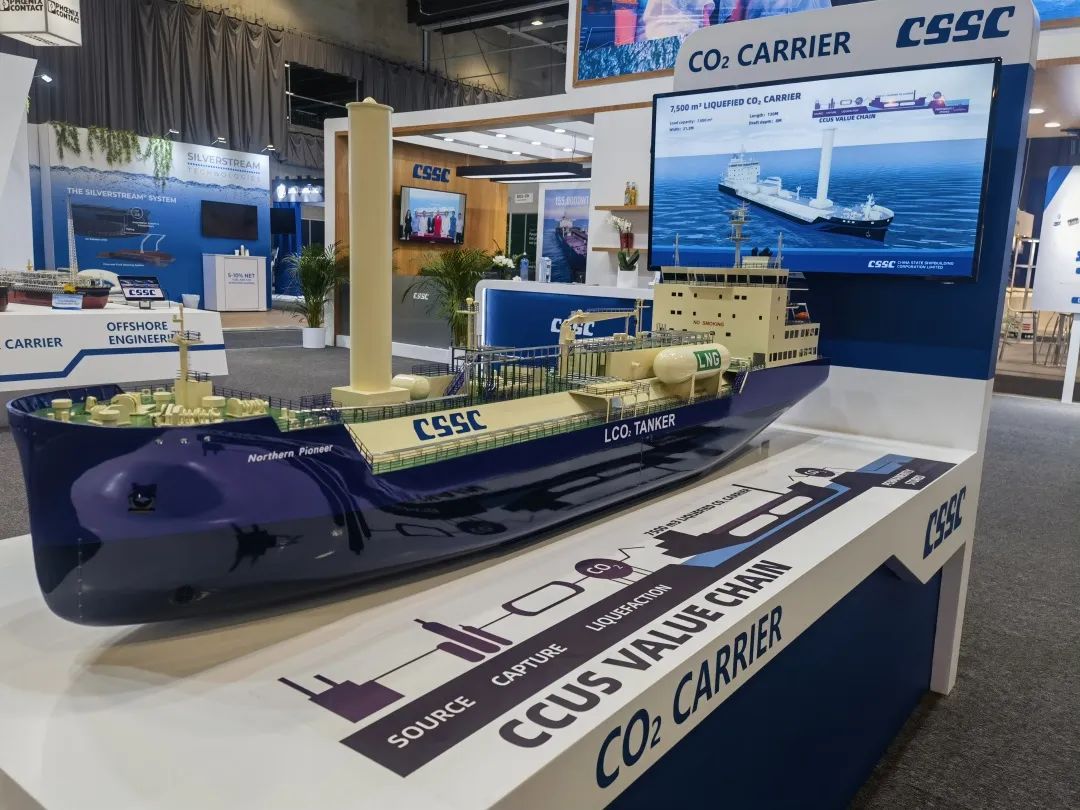 本次展會(huì),中國(guó)船舶集團(tuán)積極踐行“走出去”發(fā)展戰(zhàn)略,緊盯目標(biāo)市場(chǎng)特點(diǎn)和需求,重點(diǎn)展示了近年來(lái)船舶海工及動(dòng)力機(jī)電產(chǎn)品在綠色、低碳、環(huán)保方面取得的最新進(jìn)展和相關(guān)成果,包括全球首制7500立方米液態(tài)二氧化碳運(yùn)輸船、17.4萬(wàn)立方米大型LNG運(yùn)輸船、7000CEU雙燃料汽車(chē)滾裝船、23000TEU超大型雙燃料集裝箱船、21萬(wàn)噸氨燃料散貨船、30萬(wàn)噸級(jí)FPSO、全球首艘10萬(wàn)噸級(jí)智慧養(yǎng)殖工船,以及 12X92DF雙燃料低速機(jī)、LNG供氣系統(tǒng)、船用碳捕捉系統(tǒng)等。集團(tuán)公司展臺(tái)吸引了眾多國(guó)內(nèi)外知名船東、船級(jí)社、設(shè)備廠商等到訪觀摩,交流了當(dāng)前市場(chǎng)熱點(diǎn)并探討了未來(lái)合作機(jī)遇。