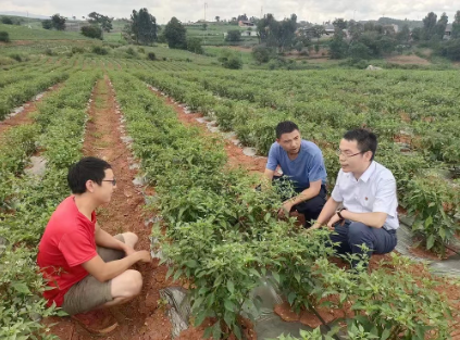▲洪術(shù)華(右一)在種植基地查看辣椒長勢