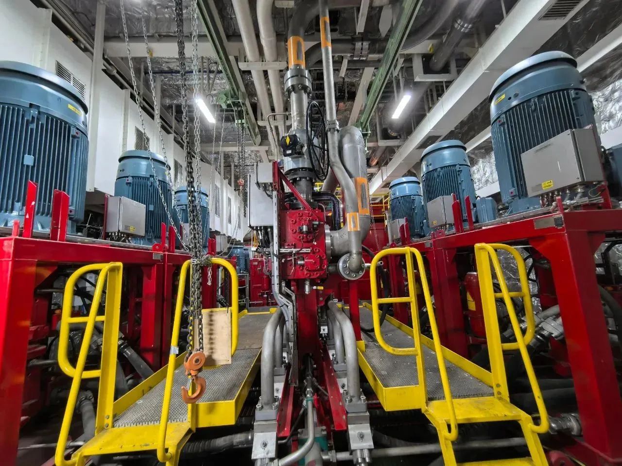 “夢(mèng)想”號(hào)鉆井系統(tǒng)提升能力強(qiáng)、反應(yīng)速度快,離不開配套的液壓提升系統(tǒng)。系統(tǒng)配有12臺(tái)泵,裝機(jī)容量達(dá)4100千瓦,高壓管路長達(dá)8000多米,直徑達(dá)270多毫米,最高壓力為350公斤/平方厘米,是家庭高壓鍋耐壓的175倍。