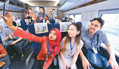 6月17日,100余名留學(xué)生從西安出發(fā),乘坐寶蘭高鐵試運(yùn)行動(dòng)車(chē)組前往蘭州,初次體驗(yàn)即將開(kāi)通運(yùn)營(yíng)的首條貫通新絲路高鐵。圖為幾名外國(guó)留學(xué)生在動(dòng)車(chē)組試驗(yàn)列車(chē)上自拍。唐振江攝(人民視覺(jué))