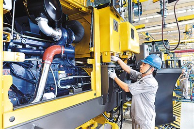 圖為山東臨工工程機(jī)械有限公司的工人在裝載機(jī)生產(chǎn)線上作業(yè)。