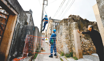 南方電網(wǎng)廣東汕頭金平供電局運維人員對當?shù)匾惶幣f線路進行改造。(潘軍 攝)