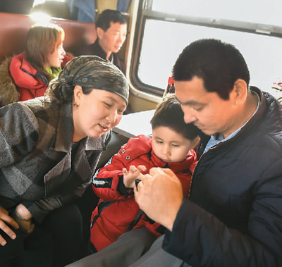 11月25日,在新疆塔克拉瑪干沙漠西南緣的喀什-和田對(duì)開火車“和田玉龍?zhí)枴鄙?,旅客們正在休息。(趙 戈 攝)