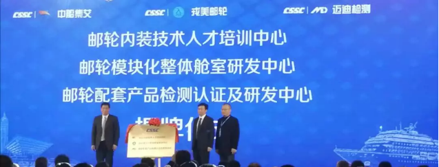 ????為解決我國(guó)郵輪配套產(chǎn)品認(rèn)證難、艙室系統(tǒng)技術(shù)水平落后、專(zhuān)業(yè)人才匱乏等問(wèn)題,在中船郵輪和中國(guó)船舶集團(tuán)所屬中船九江海洋裝備(集團(tuán))有限公司的指導(dǎo)下,中國(guó)船舶集團(tuán)所屬中船集艾郵輪科技發(fā)展(上海)有限公司聯(lián)合中國(guó)船級(jí)社和上海工程技術(shù)大學(xué)成立了《郵輪配套產(chǎn)品測(cè)試認(rèn)證及研發(fā)中心》、《郵輪模塊化整體艙室研發(fā)中心》和《郵輪內(nèi)裝技術(shù)人才培訓(xùn)中心》,并在會(huì)上正式揭牌。