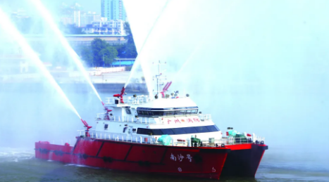 2010年12月28日,廣船國際為南沙區(qū)建造的“南沙號(hào)”消防船投入使用?!澳仙程?hào)”消防船總長46米,型寬15米,排水量達(dá)到680噸,航速可達(dá)32.4公里/小時(shí),共設(shè)置有6門水炮。其中,2門主炮射程可達(dá)到150米,4門副炮射程可達(dá)到130米;還設(shè)置了全船水幕保護(hù)系統(tǒng),在火災(zāi)現(xiàn)場可有效保護(hù)自身安全?!澳仙程?hào)”消防船是當(dāng)時(shí)國內(nèi)最大雙體專勤消防船,大大增強(qiáng)了對(duì)船舶火災(zāi)、石化碼頭、油庫火災(zāi)的撲救能力。