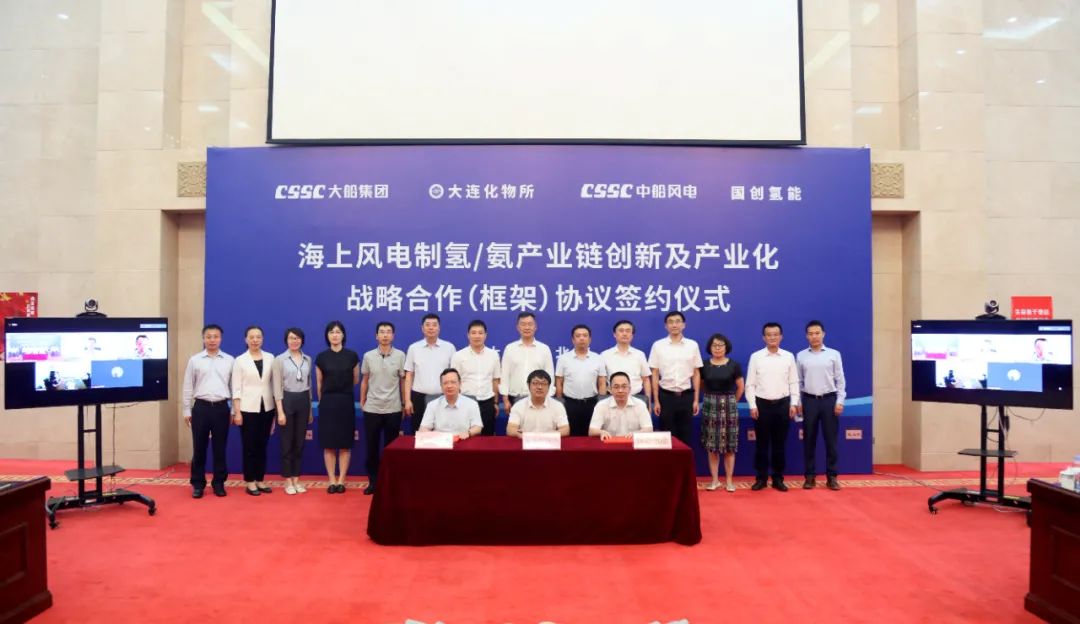 8月6日,中國船舶集團(tuán)旗下大船集團(tuán)舉行《海上風(fēng)電制氫/氨產(chǎn)業(yè)鏈創(chuàng)新及產(chǎn)業(yè)化戰(zhàn)略合作(框架)協(xié)議》簽約儀式。大船集團(tuán)與大連化物所、國創(chuàng)氫能、中船風(fēng)電四方代表在協(xié)議書上簽字。