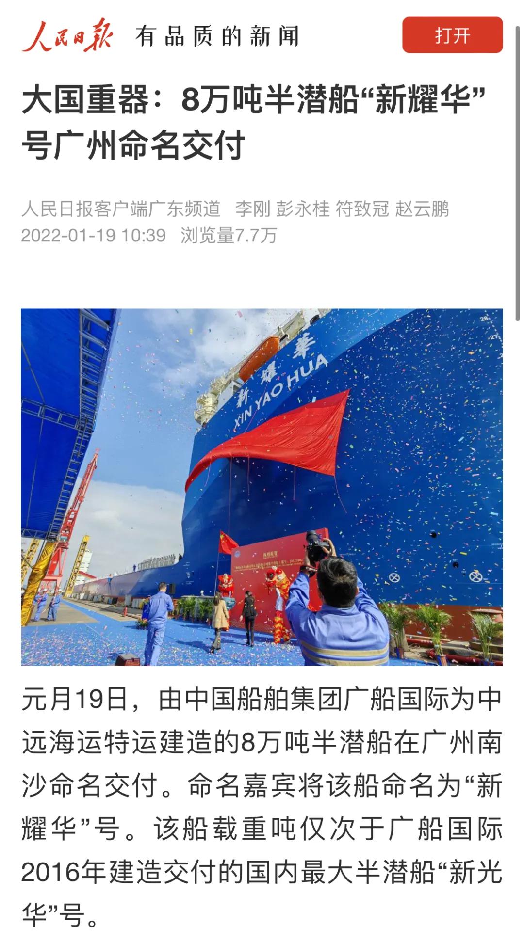 1月19日,由中國(guó)船舶集團(tuán)旗下廣船國(guó)際建造的8萬(wàn)噸半潛船“新耀華”號(hào)命名交付。