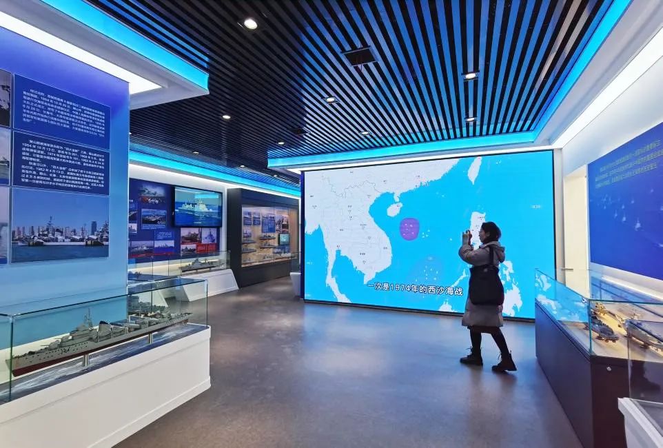 現(xiàn)代海軍裝備主題展館分室內、室外兩個展區(qū),設立六個篇章,重點展示了人民海軍成立以來艦船裝備從沿岸近海到走向深遠海的代表成果。除圖文影視、模型外,展覽還引入了航母艦載機起降虛擬體驗、海盜射擊游戲、艦載機起飛指揮等多個體驗互動類項目。
