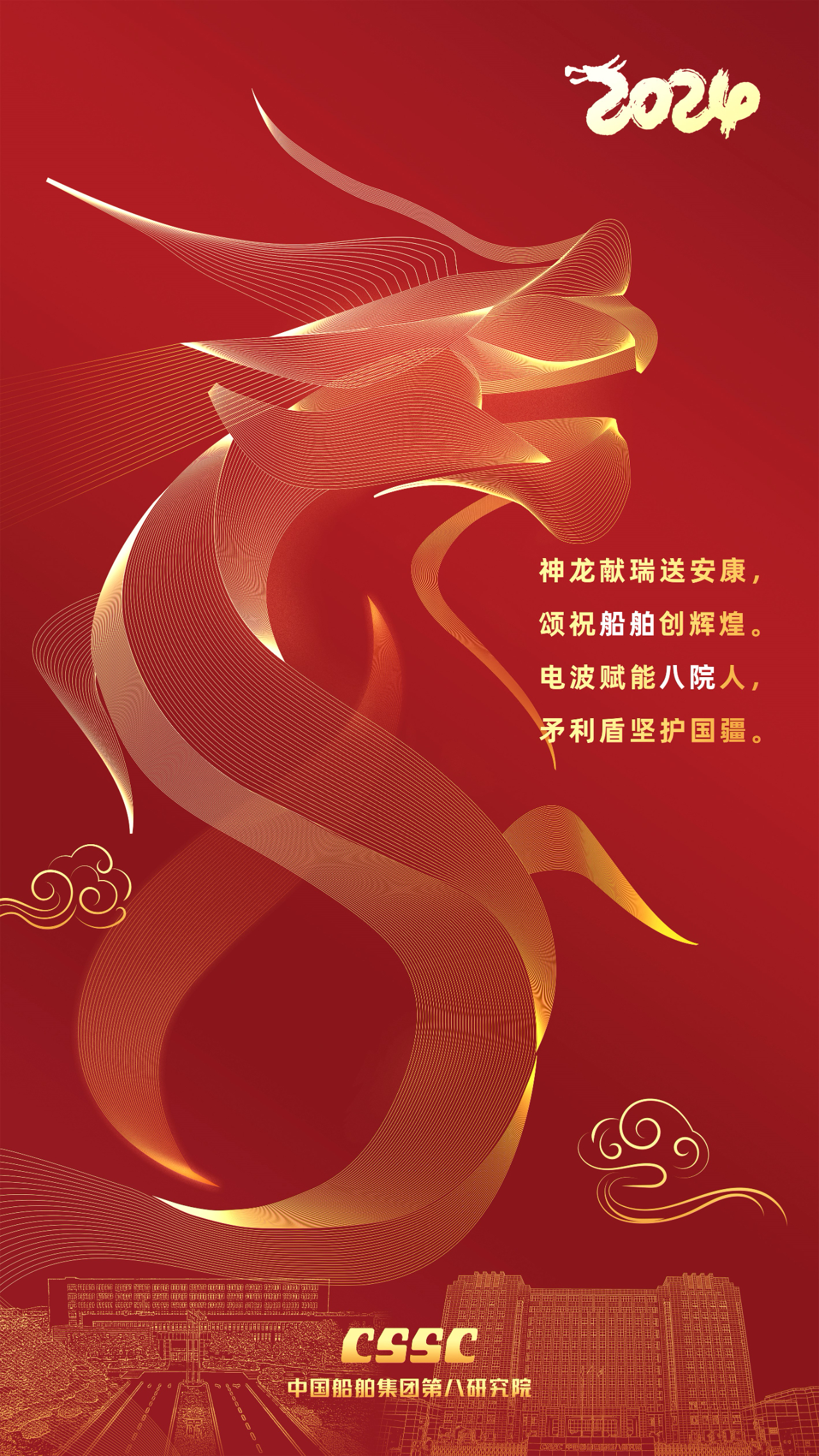 創(chuàng)意說(shuō)明:海報(bào)中龍的花紋是電磁波圖形,體現(xiàn)八院的專(zhuān)業(yè)特色;龍的整體造型為8字型,意為八院;兩院區(qū)主樓上空飄祥云,寓意祥龍送喜,福照八院!