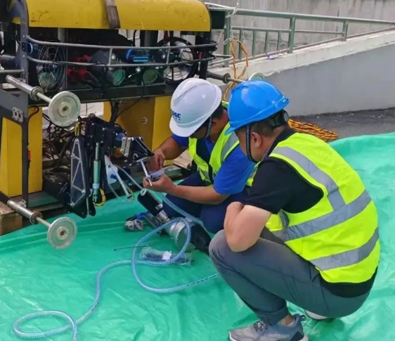 項(xiàng)目組成員克服高溫高濕的環(huán)境和艱苦條件,歷時近十天圓滿完成有關(guān)試驗(yàn)任務(wù)。本次外場試驗(yàn),充分驗(yàn)證并優(yōu)化了七〇二所在水下工程領(lǐng)域的核心技術(shù),包括水下裂縫檢測、水下裂縫修復(fù)、水下嵌填、水工建筑物表面清理及水下插拔等關(guān)鍵技術(shù)的實(shí)際應(yīng)用效果與操作效率。
