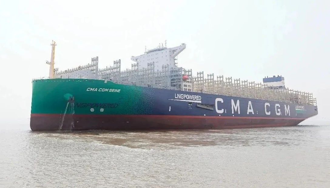 該船是法國(guó)達(dá)飛集團(tuán)在滬東中華訂造的4艘24000TEU級(jí)雙燃料動(dòng)力集裝箱船的首制船,也是滬東中華繼2020年9月完工交付的全球首創(chuàng)23000TEU雙燃料動(dòng)力集裝箱船的升級(jí)優(yōu)化型集裝箱船。該船總長(zhǎng)399米,可一次裝下23872個(gè)集裝箱,包括2200個(gè)標(biāo)準(zhǔn)冷藏集裝箱,最大堆箱層數(shù)達(dá)24層,相當(dāng)于22層樓高度,是新一代海上“綠巨人”和“帶貨王”。