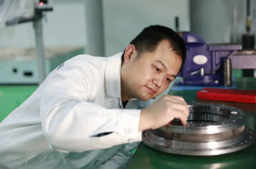 “必須持之以恒地以精益求精、精雕細(xì)琢的工匠精神打造所經(jīng)手的每個(gè)產(chǎn)品!”這是周虎常提的一句話。燃?xì)廨啓C(jī)機(jī)匣零組件制造精度要求高,裝配質(zhì)量控制嚴(yán),其加工、裝配工藝技術(shù)代表機(jī)械制造行業(yè)的先進(jìn)水平。武漢船機(jī)首套燃?xì)廨啓C(jī)機(jī)匣產(chǎn)品裝配工作由周虎帶領(lǐng)班組成員進(jìn)行,其高超的技能水平保障了產(chǎn)品的裝配質(zhì)量與進(jìn)度。在25兆瓦燃?xì)廨啓C(jī)過(guò)渡段機(jī)匣葉片裝配過(guò)程中,因葉片與機(jī)匣外環(huán)裝配為燕尾槽式的榫接結(jié)構(gòu),葉片榫頭與燕尾榫槽三面的接觸面積要求高達(dá)80%以上,需由鉗工拂配以達(dá)該指標(biāo)。葉片榫頭拂配過(guò)程中,周虎采用銼刀銼削裝配面,利用其長(zhǎng)期磨練掌握的良好手感,將銼削量誤差控制在0.005-0.01毫米,大大減少了葉片試裝配次數(shù),裝配效率顯著提升。