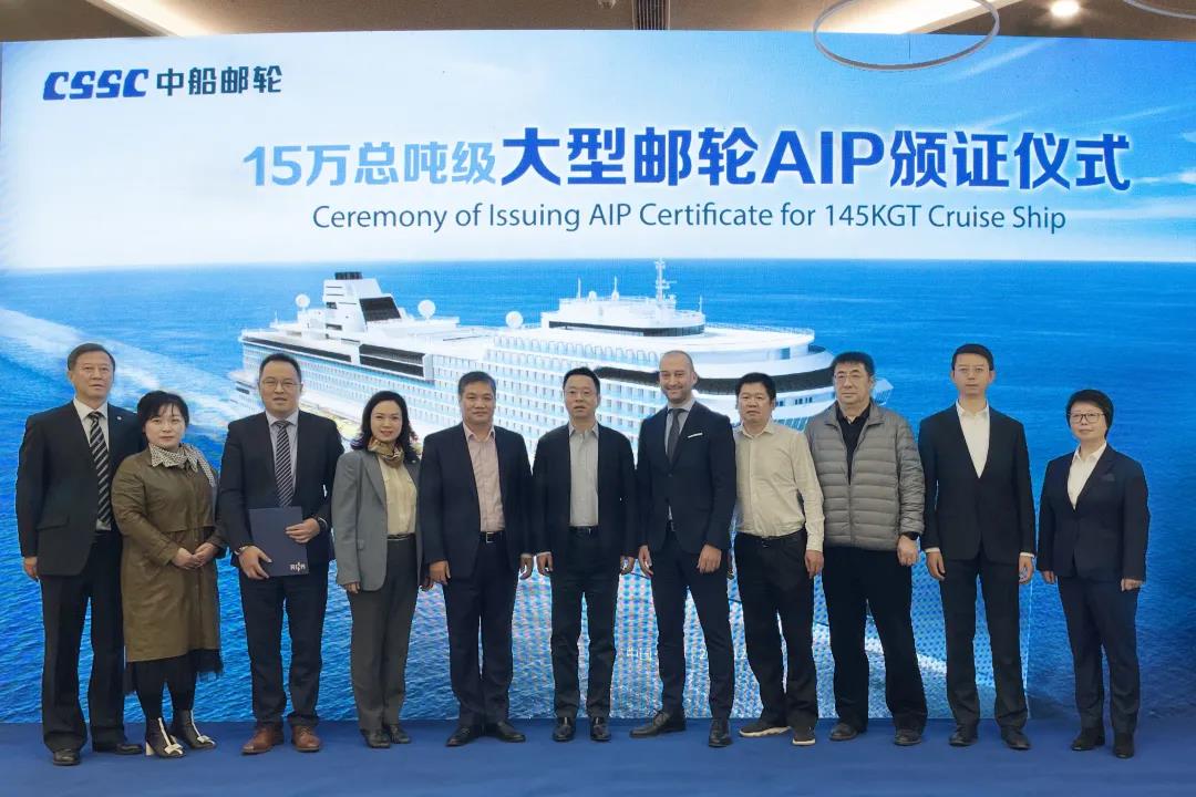 12月9日,中國船舶集團旗下中船郵輪自主研發(fā)設計的15萬總噸級大型郵輪獲得意大利船級社原則性認可(AIP)證書。這是中國首次獨立自主研發(fā)設計的完全擁有自主知識產權的大型郵輪,一舉打破國外在該領域長期技術封鎖和壟斷,開啟中國大型郵輪自主設計新時代。中國船舶集團黨組成員、副總經理盛紀綱出席授證儀式并講話。