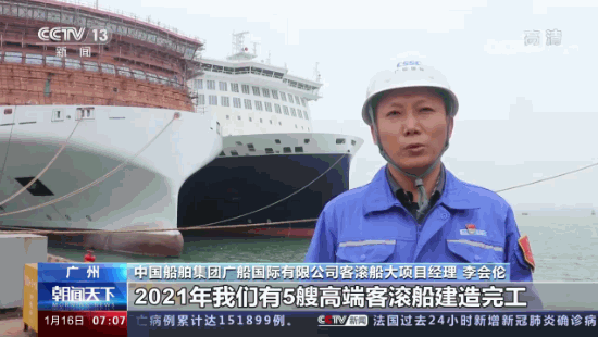 這里是中國船舶廣船國際的造船碼頭,多艘大型豪華客滾船正在緊張調試和建造。負責人告訴記者,2021年,像這樣的高端客滾船他們廠一共建造完工了5艘,產值占比達到約40%。