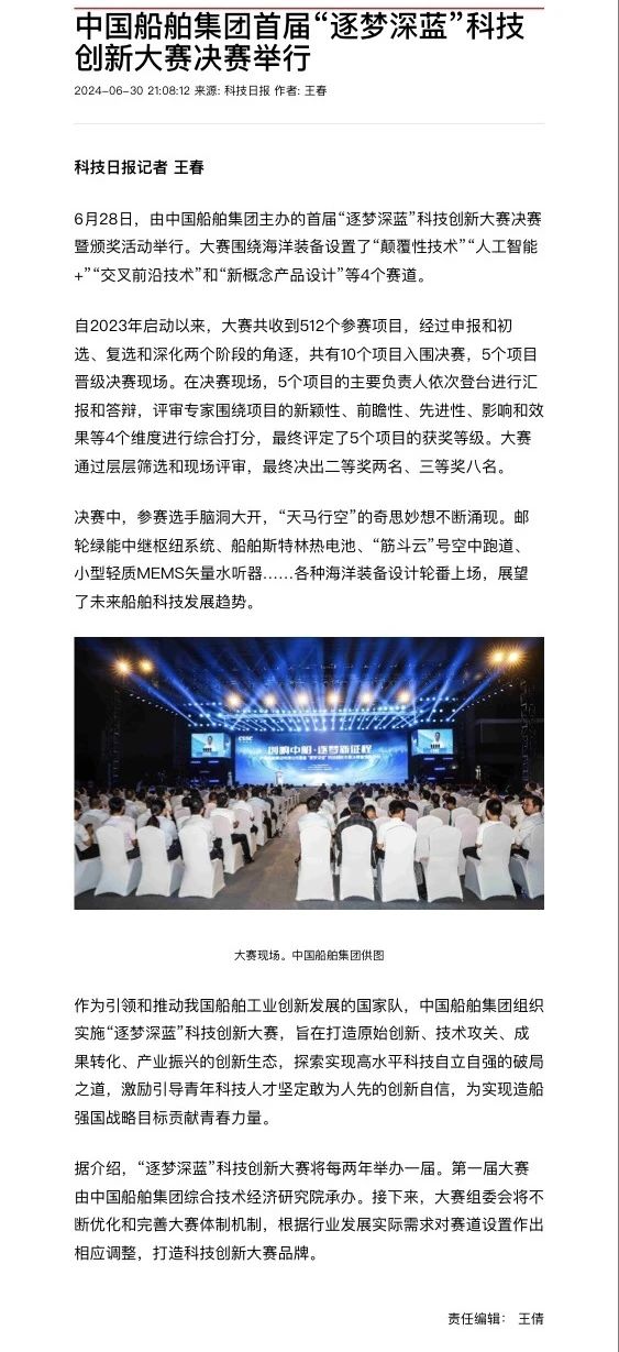 中國船舶集團有限公司主辦的首屆“逐夢深藍”科技創(chuàng)新大賽決賽暨頒獎活動引來各大媒體的關(guān)注,獲得高度評價。——>活動回顧